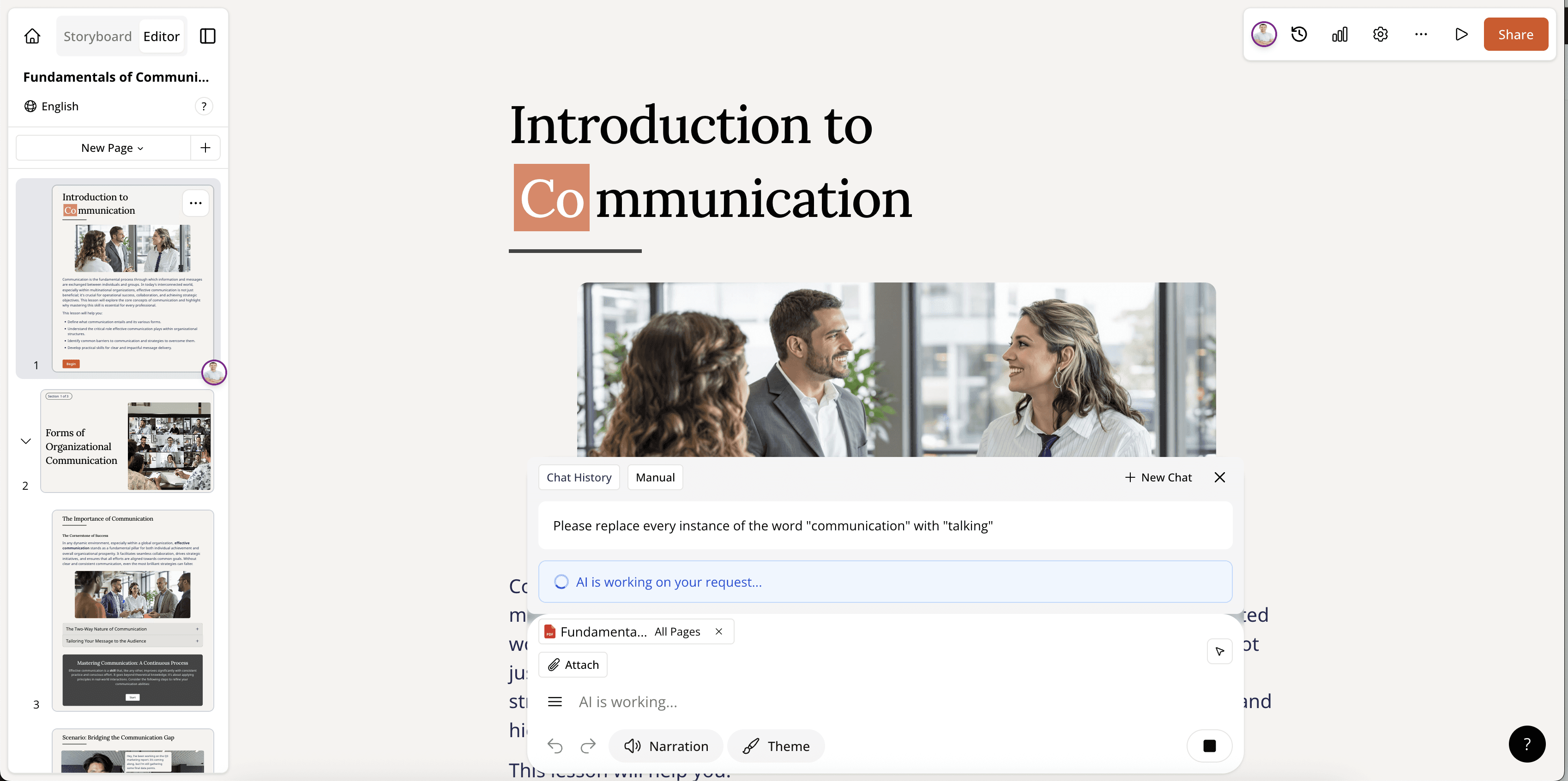 This feature is the foundation of a more advanced way to generate and edit content within Mindsmith. Unlike traditional AI tools that simply take instructions, this agent actively reasons over your documents and content. It can: